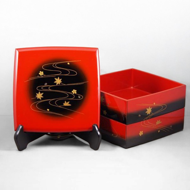 輪島塗二段重 ぼかし塗 「流水に春秋」蒔絵